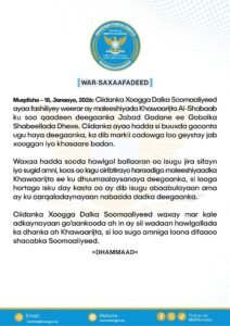 Waxaa hadda socda Hawlgal Ballaaran oo isugu jira Sifayn iyo Sugid Amni, kaas oo lagu Ciribtirayo Haraadiga Maleeshiyaadka Khawaarijta ee ku Dhuumaalaysanaya Deegaanka, si looga hortago isku day kasta oo ay dib Isu Abaabulayaan ama ay ku Carqaladaynayaan Nabadda Dadka Deegaanka.